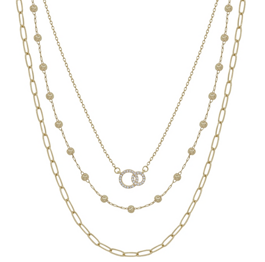 Triple Layered Chain and Rhinestone Circle Necklace