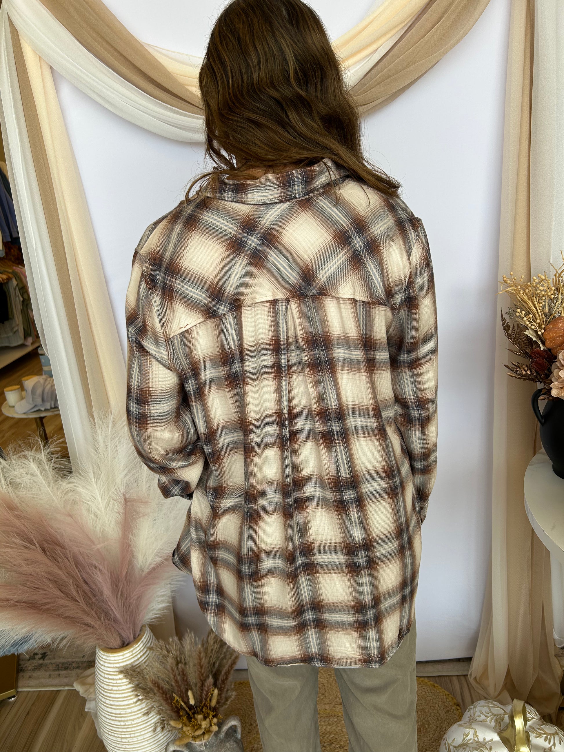 Plaid pattern with a bold button-down style, featuring a single chest pocket in front. Designed with long sleeves, a classic collar, and relaxed drop shoulders. The round hem falls below the hip, offering an oversized, ultra-soft fit perfect for autumn and winter. Pictured is Chloee wearing a large for an even more oversized look.