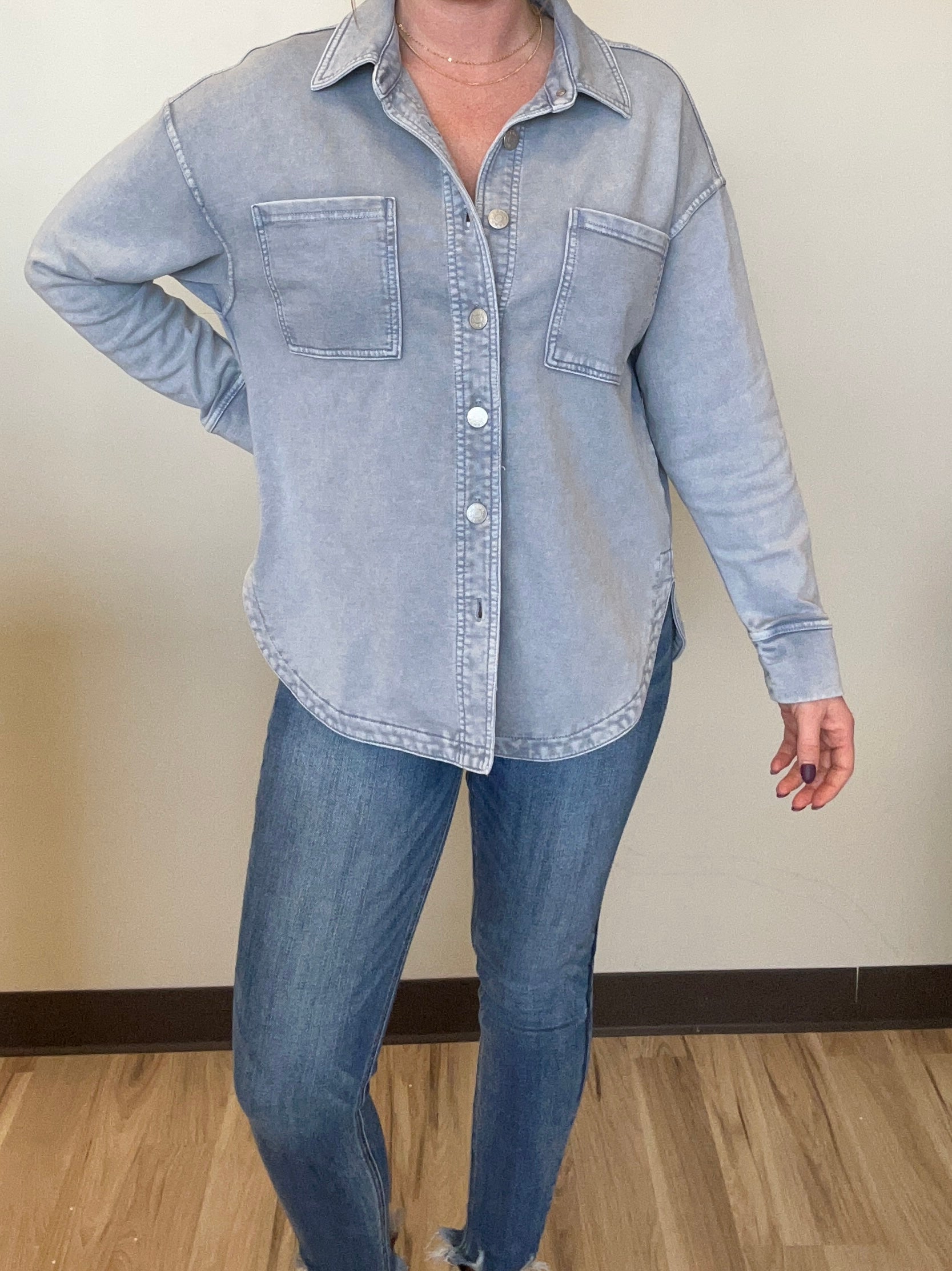 Embrace effortless edge with The Willow Shacket—a fearless take on casual layering. Crafted from buttery-soft, stretchy fabric with authentic denim aesthetics, this oversized shirt jacket commands attention with its bold silhouette. Collared neckline, long sleeves, and functional front buttons deliver classic structure, while chest pockets add practical flair. The rounded hemline hits below the hip for a daring, relaxed vibe that works solo or layered. Comfort meets attitude in this versatile piece that refuses to play it safe.l