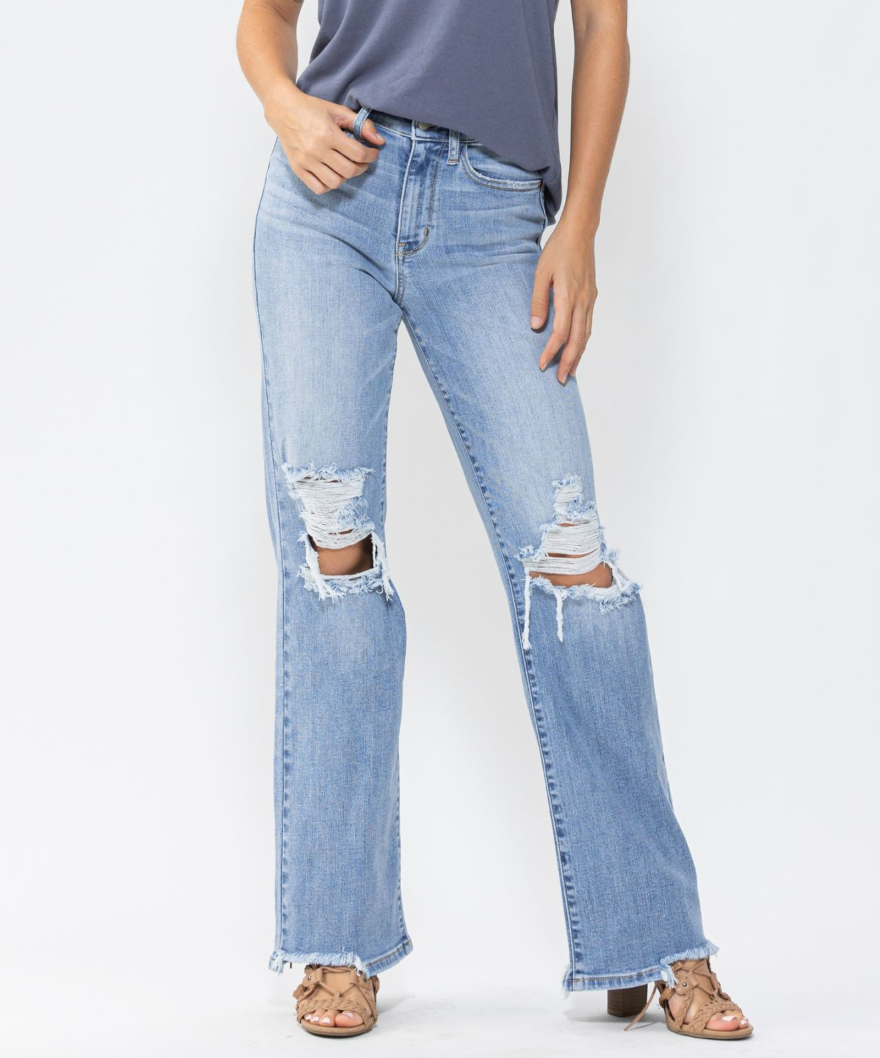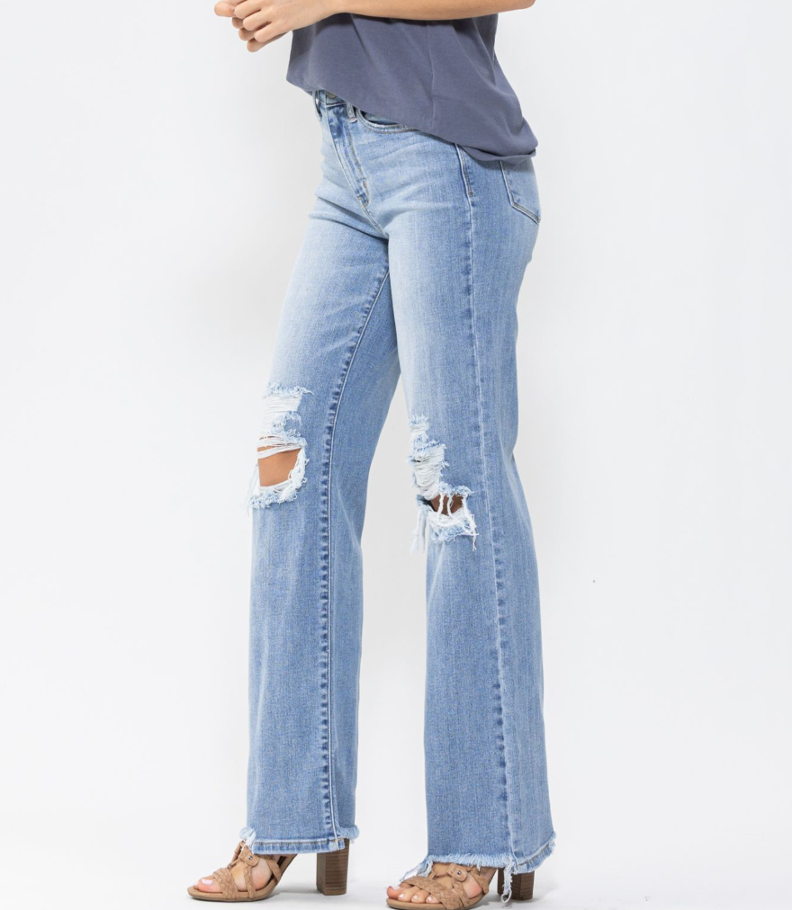Step into the 90's with our JUDY BLUE straight jeans featuring trendy knee destruction. These retro-inspired jeans offer a stylish and edgy look, perfect for any occasion. Crafted with high-quality denim, they provide a comfortable fit and durable design. Upgrade your wardrobe with these must-have jeans.