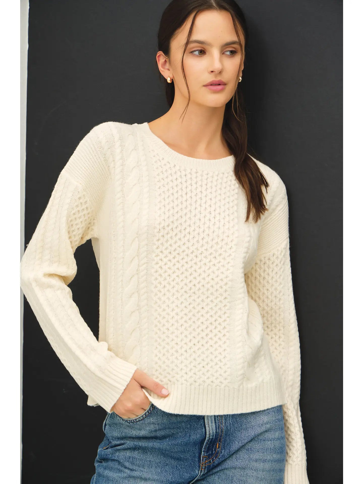 Boldly embrace comfort with this cable knit sweater top. Featuring a soft touch fabric, long sleeves, and a relaxed, oversized fit with drop shoulders and a round neckline, it redefines effortless style with an edge.