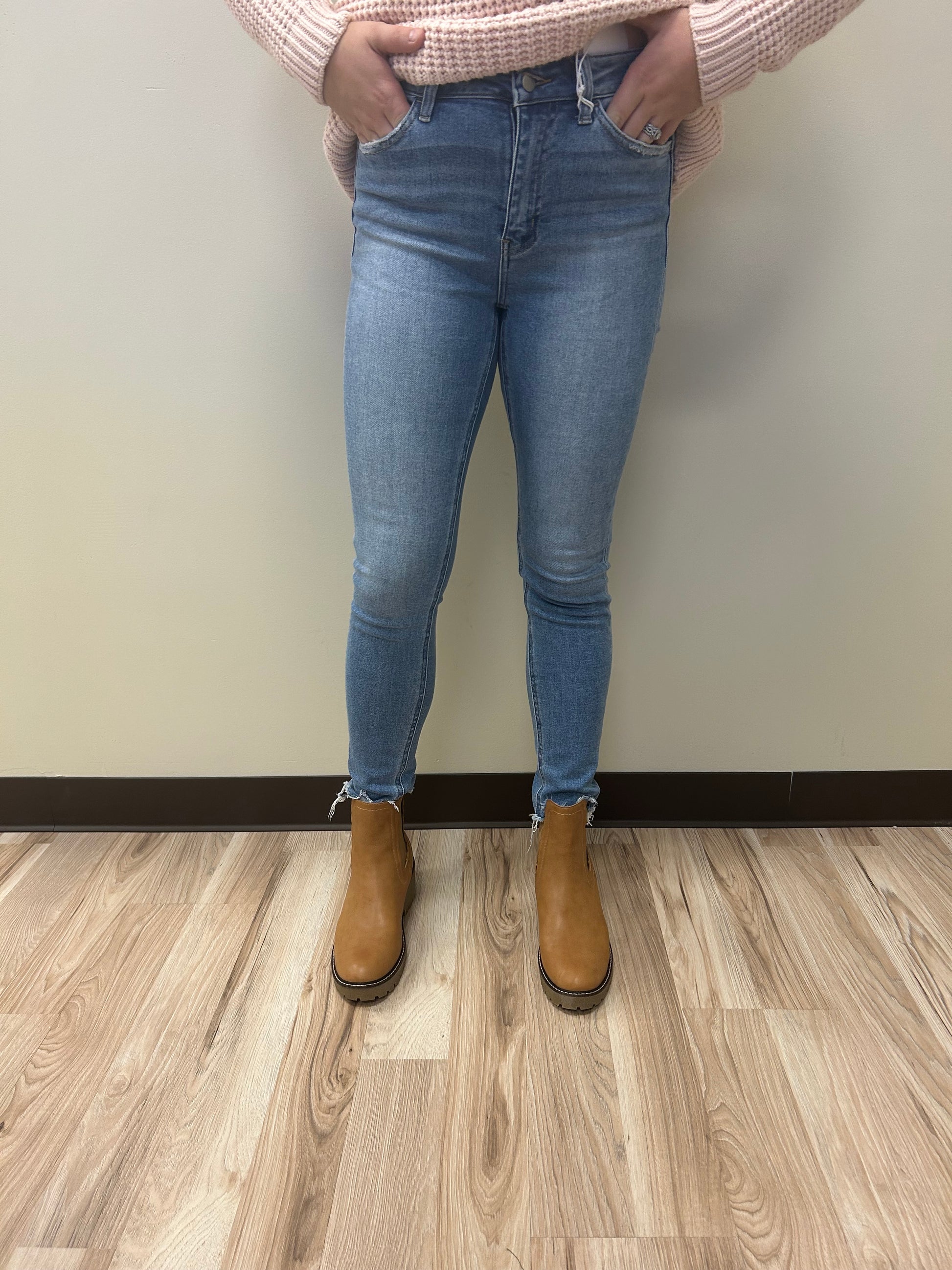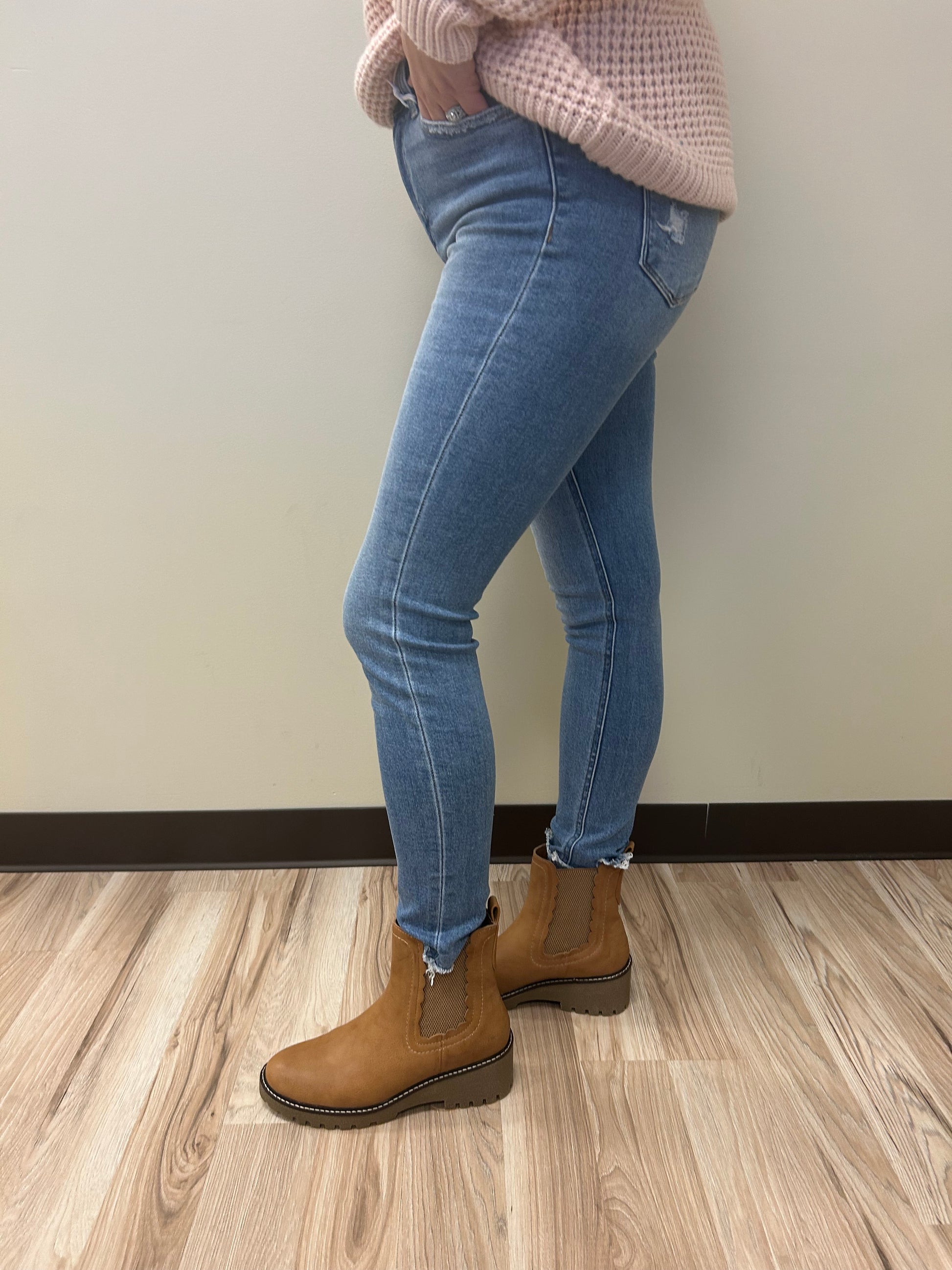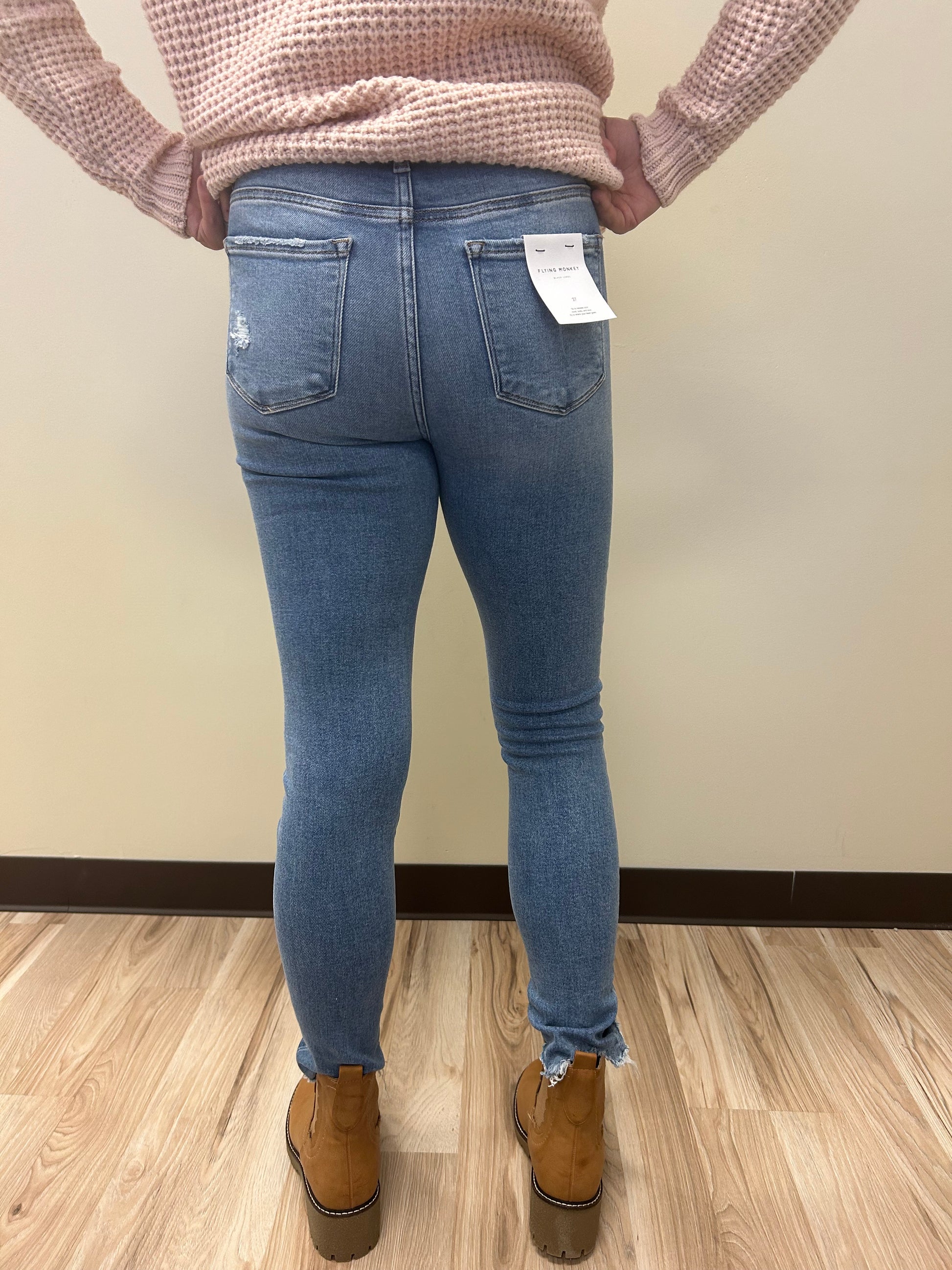 Explore new horizons in our High Rise Comfort Stretch Denim. These ankle length, skinny jeans feature a distressed detail for a bold fashion statement. Conquer your day in style and comfort.