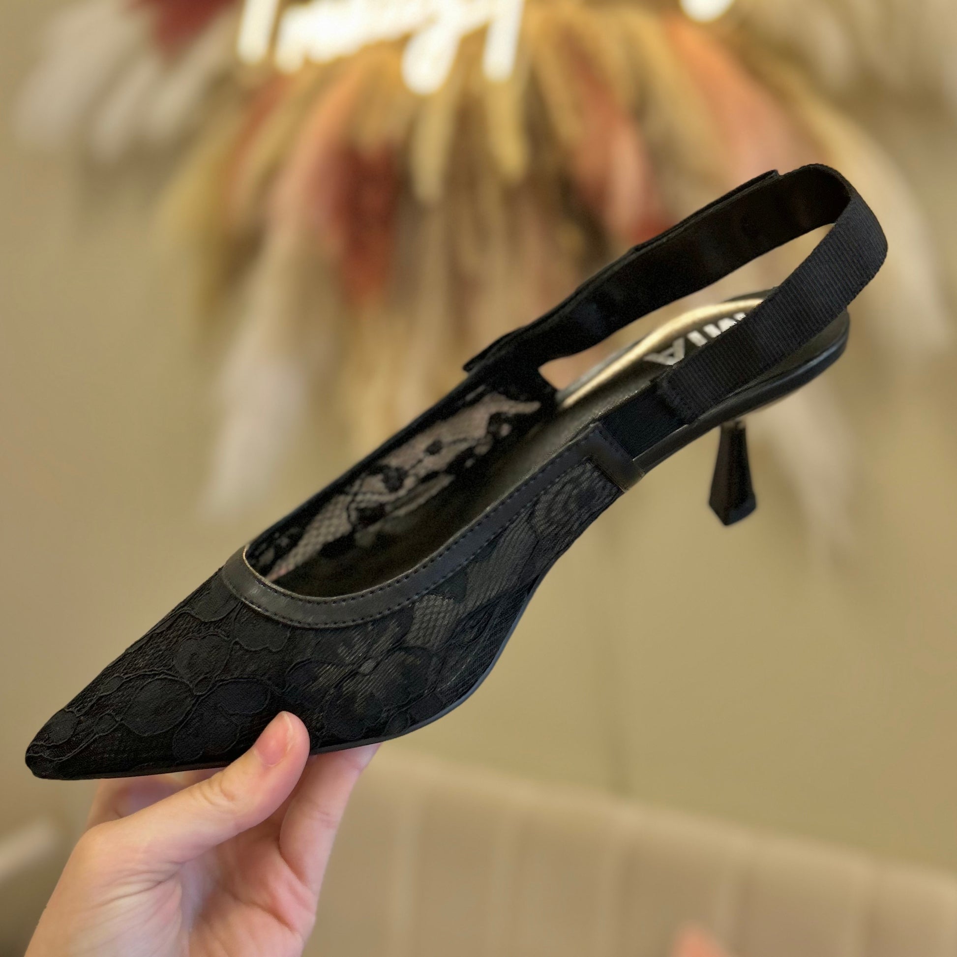 Introducing Naida—the audacious slingback that commands attention. With its striking black lace design and sharp pointed silhouette, this 2.5-inch heel delivers bold sophistication for those who refuse to blend in. Perfect for date nights, galas, or any occasion where you want to make a statement. Daring, elegant, unforgettable.