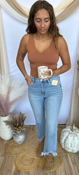 Experience the ultimate in comfort with this soft, stretchy jersey tank. Designed with a sleek slim fit and a daring V-neckline in front and back, this sleeveless basic is double lined for added security. Crafted from a spandex blend, it hugs your body perfectly. Pictured is Chloee wearing a medium.