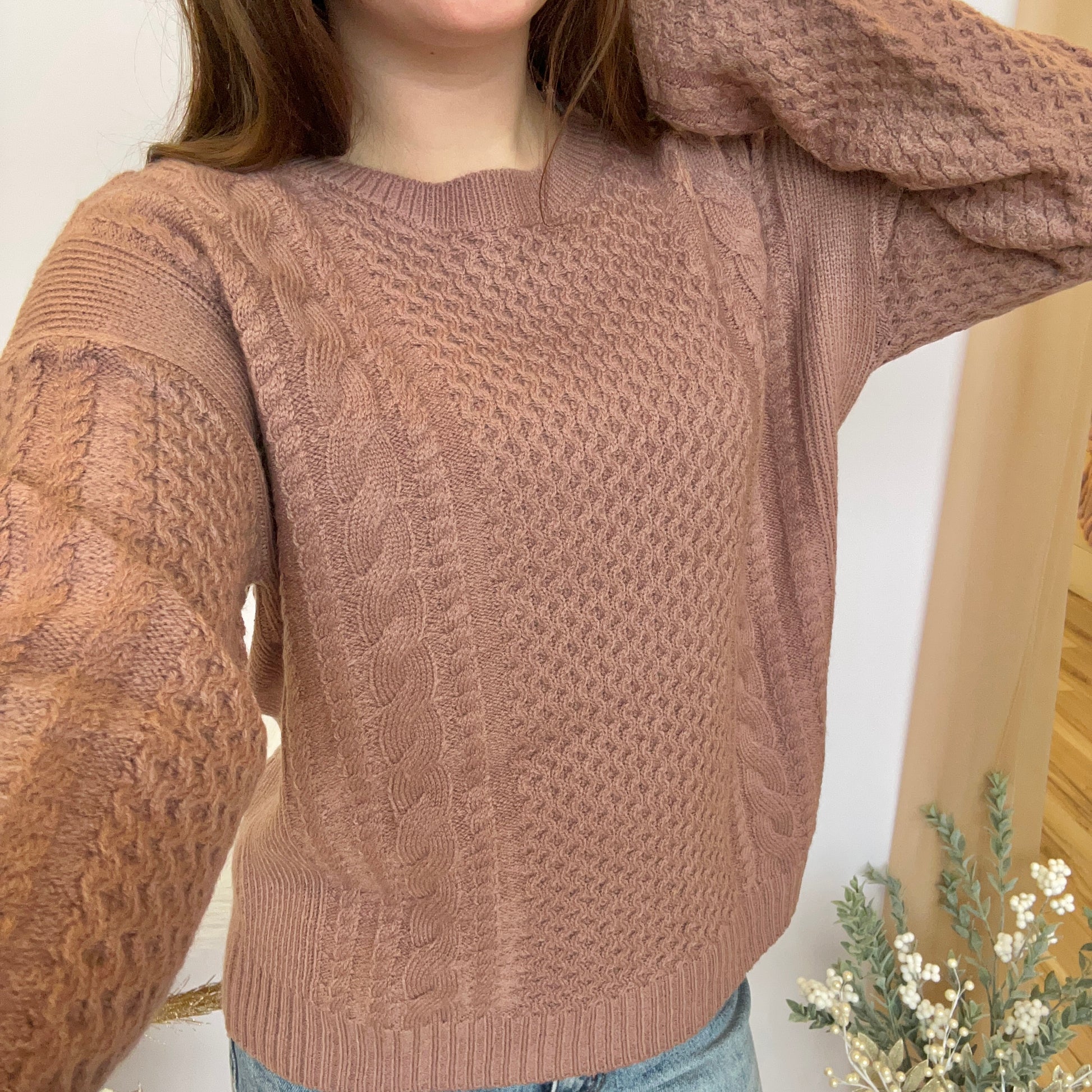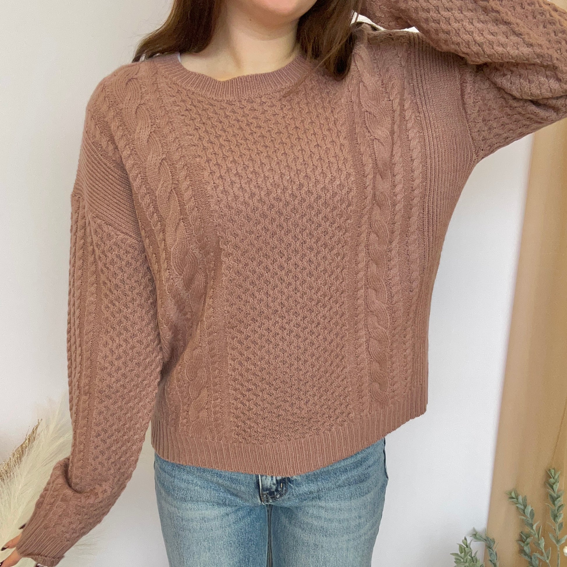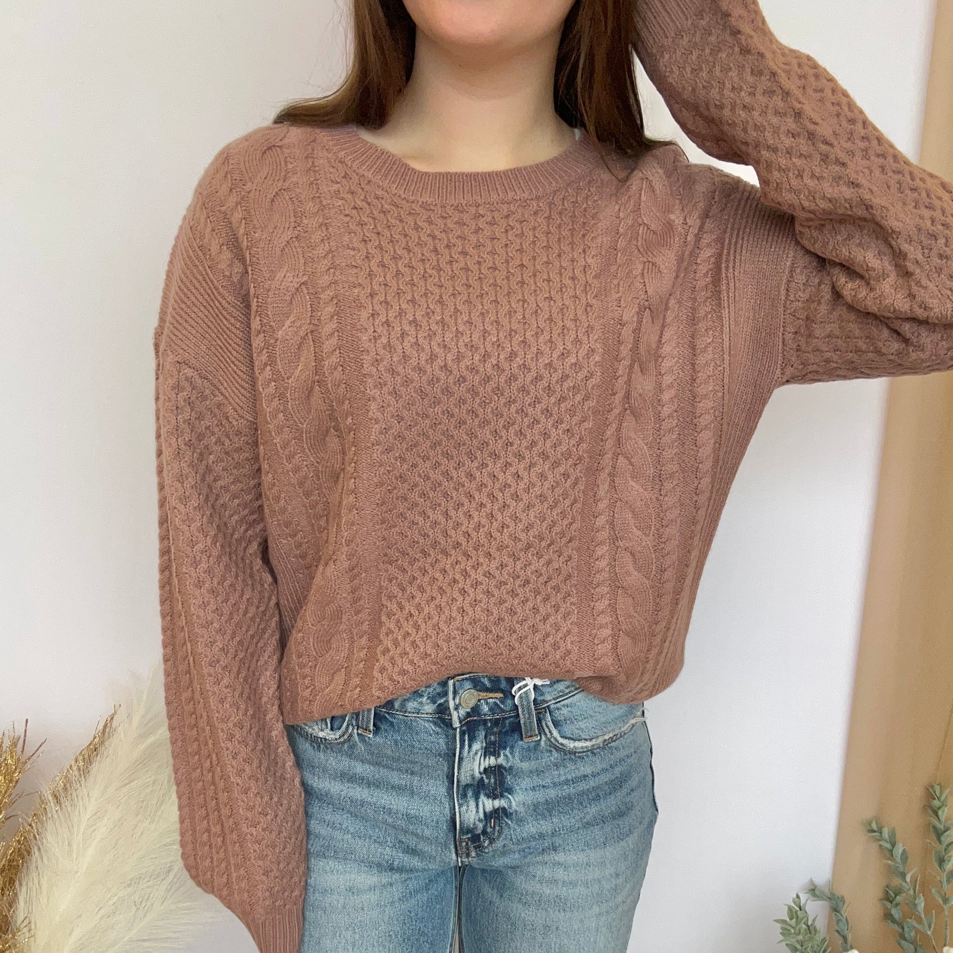 Embrace bold comfort with this cable-knit sweater featuring a plush, soft touch. Designed with long sleeves and a relaxed, oversized silhouette, it drops effortlessly at the shoulders and frames your neck with a classic round cut. Make a statement in cozy style.