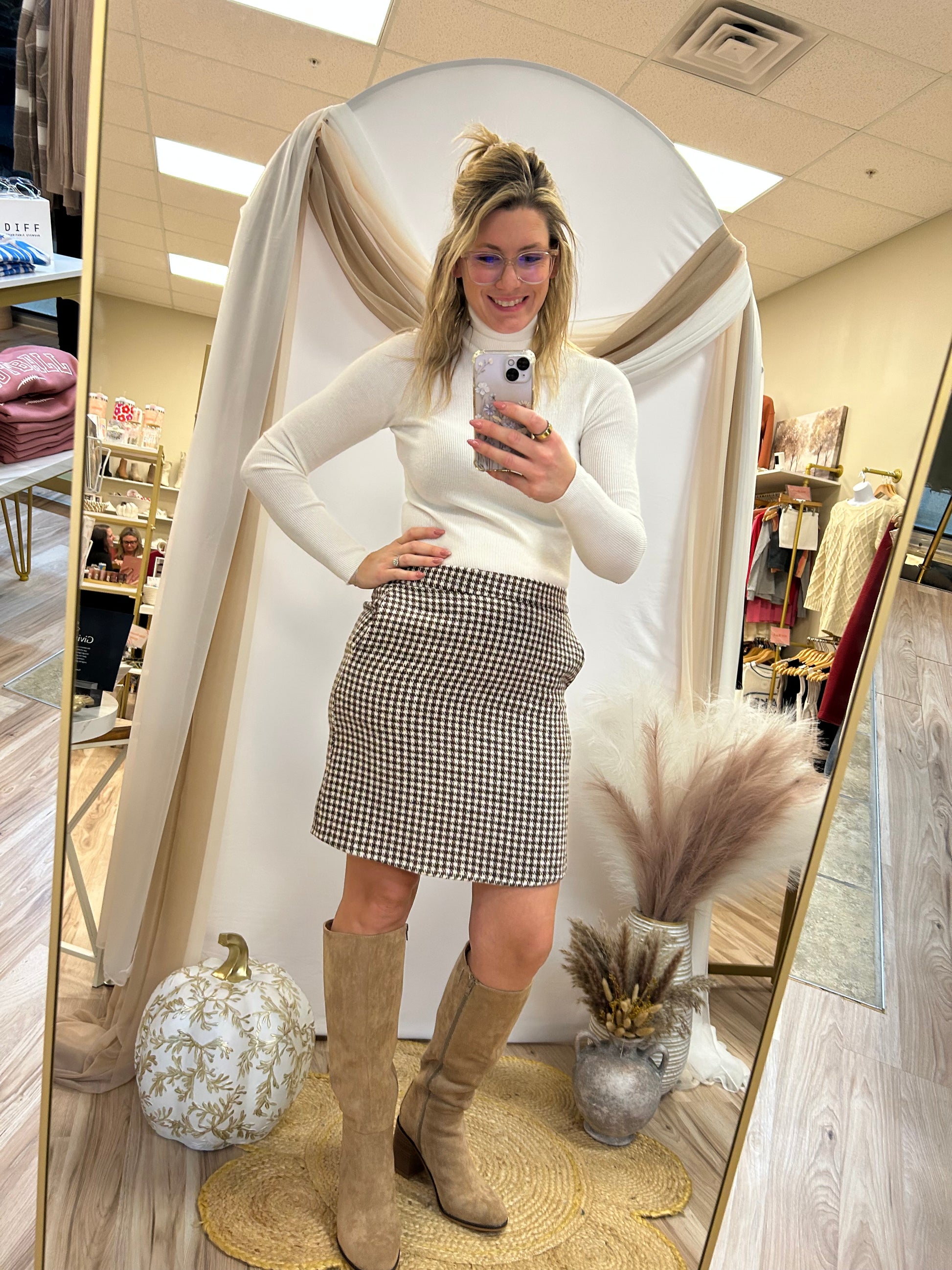 The Uptown Mini features an elastic waistband, side zipper, and convenient pockets. Perfectly blending sophistication with comfort, it’s your go-to for bold holiday looks or unforgettable date nights.