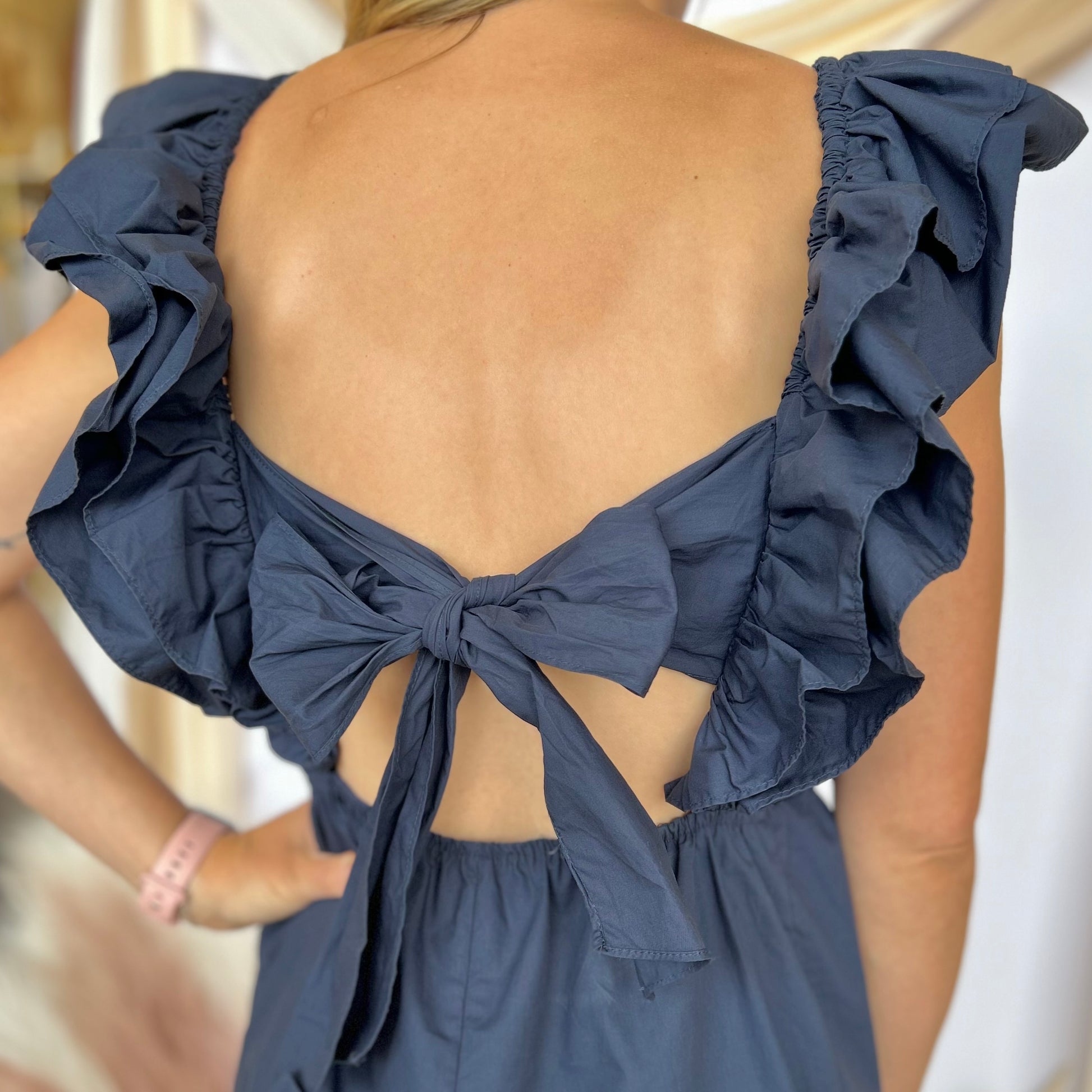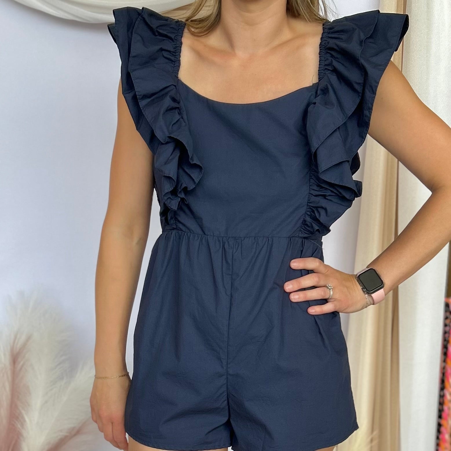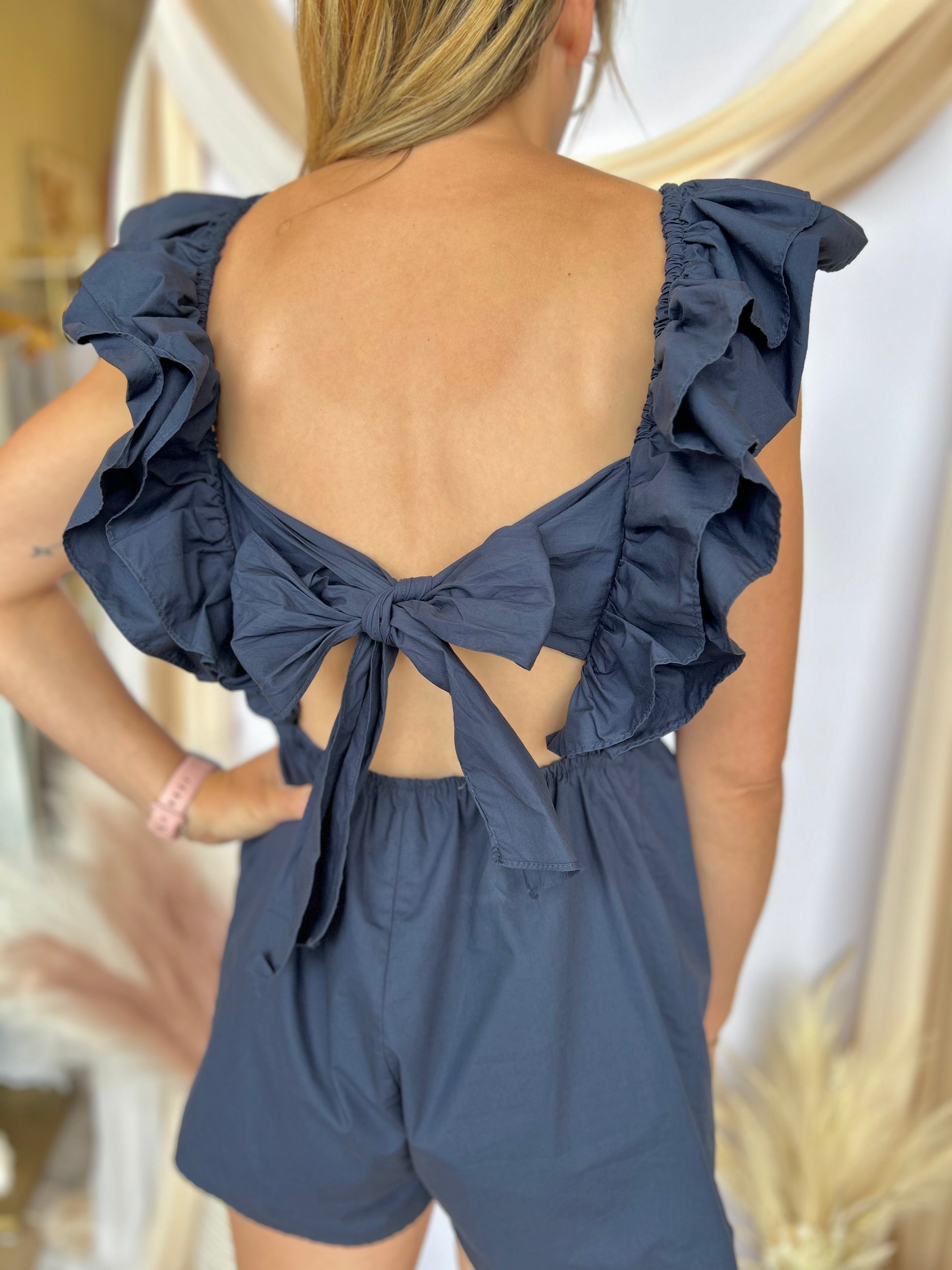 Boost your game with our UP YOUR GAME NAVY RUFFLE ROMPER! This romper features double layered ruffle sleeves, adding a touch of boldness and movement to your outfit. Elevate your style and confidence with this one-of-a-kind piece.