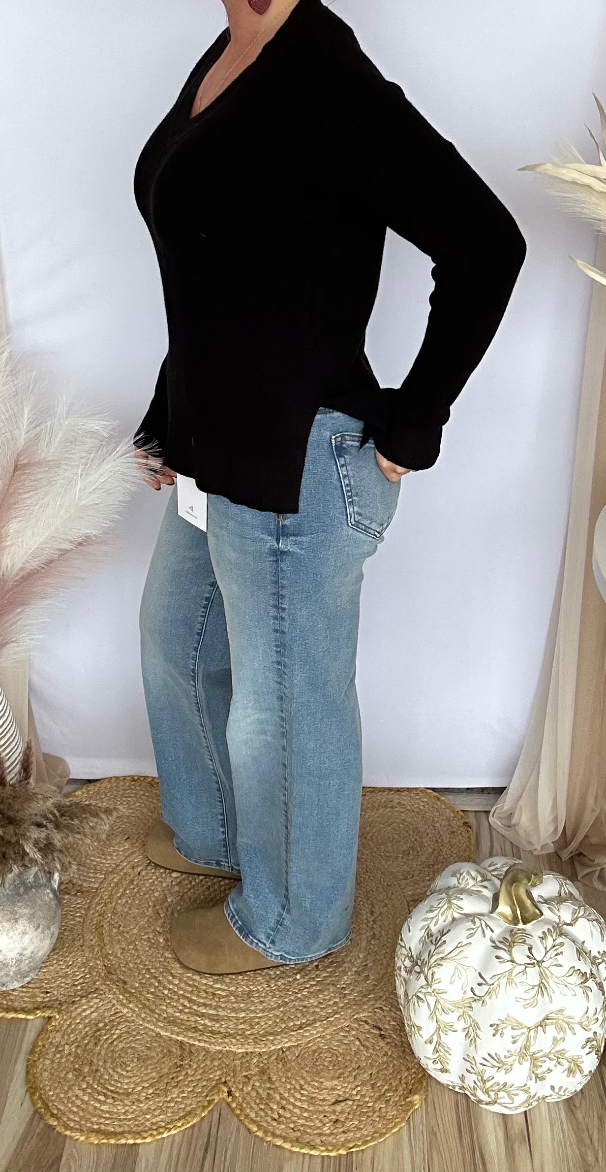 Embrace bold comfort with The Sunday Stroll Sweater. Its black and white waffle-knit texture brings edge to classic softness, while the sleek V-neck and side slits cut a daring silhouette. Crafted from smooth viscose, this fine gauge design drapes effortlessly, making it the statement layer that transforms your fall wardrobe—whether solo on a crisp day or layered for maximum impact.